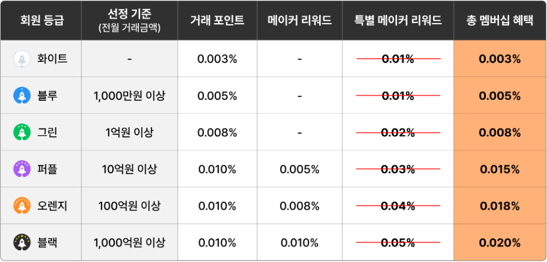 전월 거래금액에 따라 매월 1일 순차적으로 전월 실적에 따른 블랙 ~ 화이트 6개의 등급이 부여되며, 등급에 따라 멤버십 혜택을 받으실 수 있습니다.
