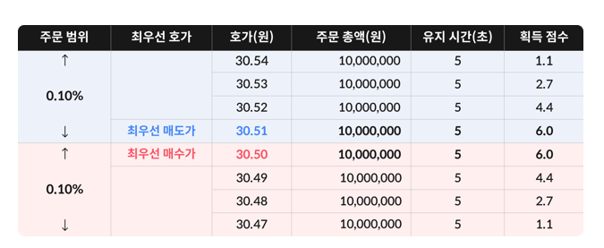 - 최우선 호가 0.1% 범위 내 2초 이상 최대 5초까지 인정되는 주문을 매수, 매도 모두에 유지한 경우 유효 주문이며, 점수가 산정됩니다.