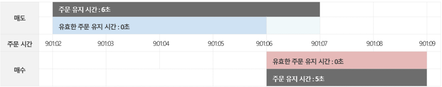 2. 매수 주문시간이 오후 9시 1분 6초부터 10초까지 유지된 경우 5초간(6,7,8,9,10) 유지시간이 인정됩니다.
