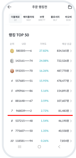(아래 랭킹 중 빨간색 선 이하는 5만원 미만으로 상금 미지급)