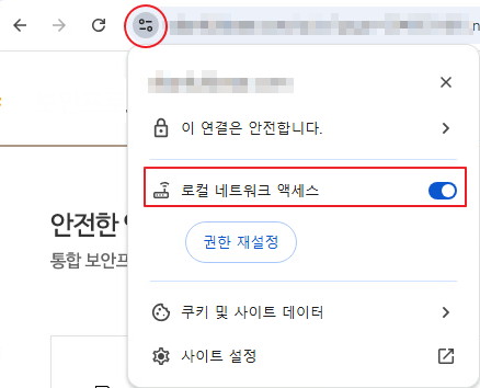 차단을 선택한 경우, 브라우저 화면 왼쪽 상단의 아이콘을 클릭하면 설정을 변경할 수 있습니다. '로컬 네트워크 액세스' 옵션을 찾아서 ON으로 변경해주십시오.