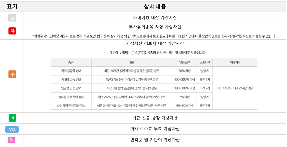 ■ Q. 가상자산명 옆에 아이콘(스,유,주,N,무료,밈) 배지는 무엇인가요?